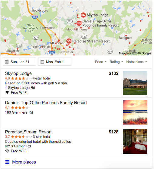 Google 3-pack while searching “Pocono Lodging”